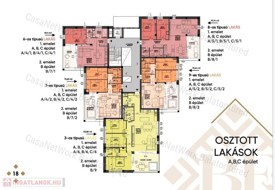 A földszinteken saját kertkapcsolattal, a köztes szinteken 3-3, a legfelső
